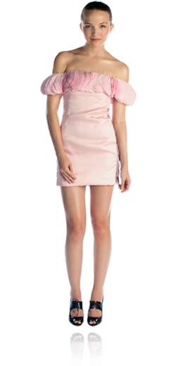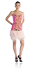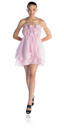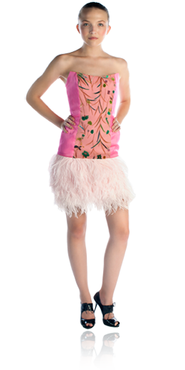 french rose pink silk satin organza strapless drop waist dress with jacquard velvet detail down center front and short tiered ostrich feather skirt