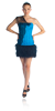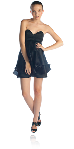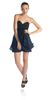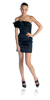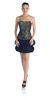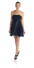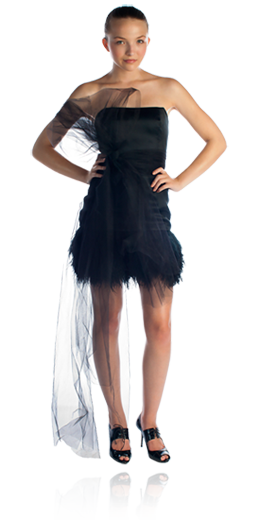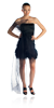 black silk satin organza strapless drop waist dress with removable tulle belt detail and short tiered ostrich feather skirt
