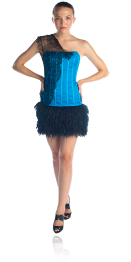 azure blue silk organza strapless dress with lace detail and short tiered ostrich feather skirt