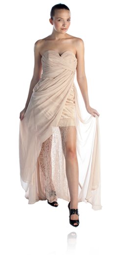 nude silk chiffon and lace strapless sweetheart natural waist gown with side slit