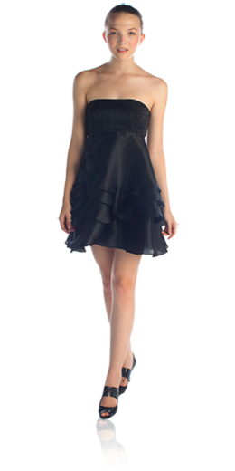black lace embroidered silk organza strapless sweetheart dress with tiered skirt