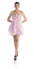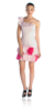 carnation pink silk organza dress with ruffled sleeve and two rows of layered silk chiffon circles at skirt