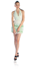 mint silk satin organza strapless natural waist dress with lace detail and short tiered ostrich feather skirt
